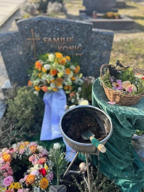Mein Deutsch ist schlecht, aber Ich probieren. Ich war die letzen Chefin Manfred. Und es gibt sieben Mitarbeitern hier heute. Aber das sind mehr (I messed this word up and said it twice, as I formed the other sentences in the Friedhof they may not be grammatically correct either but don’t harsh my mellow). We were Manfred’s friends.